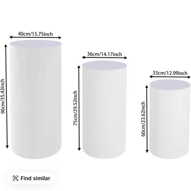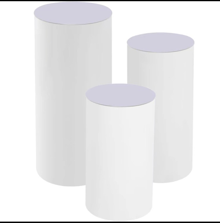 Three round cylinder pedestal stands — a set of three matching pedestals that bring height, structure, and style to any event display. Each pedestal features a clean, cylindrical column and a flat circular top, perfect for showcasing cakes, floral arrangements, trophies, decorative accents, or signage. Their compact footprint lets you tuck them into corners or line them up down an aisle, while the stepped trio arrangement creates visual interest and layered presentation. Designed for rental use, they’re easy to place, reposition, and pair with linens, props, or lighting to match your event’s theme. Ideal for weddings, birthdays, trade shows, or photo backdrops, these pedestals elevate focal pieces without distracting from them.